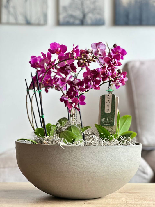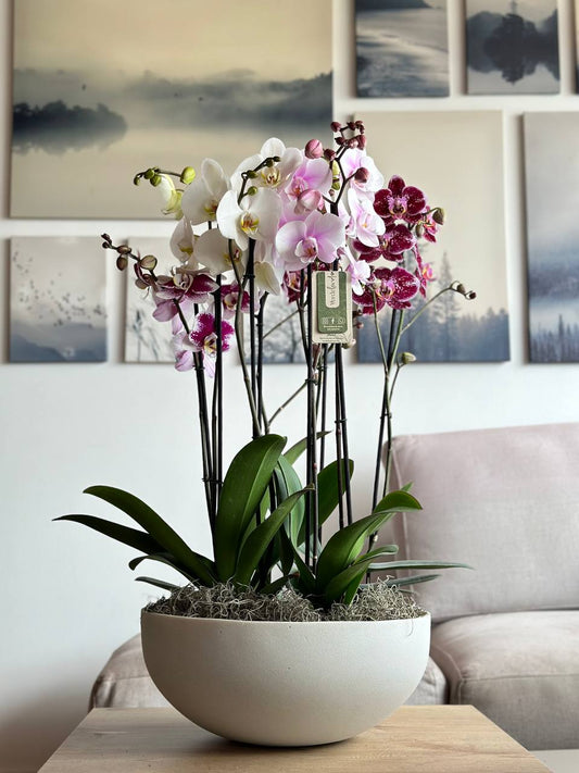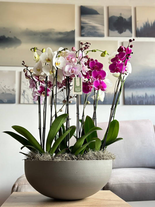Nuestros jardines mezclan varias orquídeas en una sola base, creando una pieza viva que transforma cualquier espacio. Son elegantes, delicados y llenos de vida.